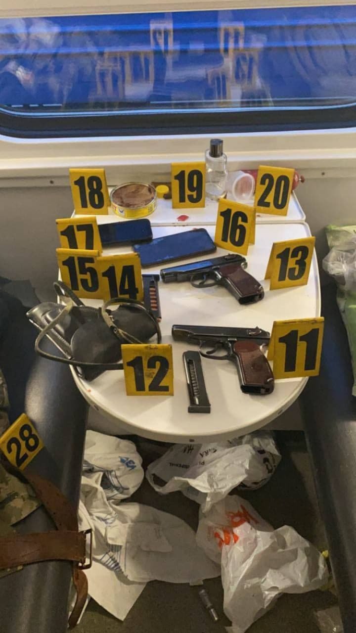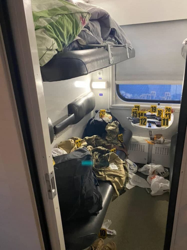 Наразі чоловіки перебувають у відділку поліції. Правоохоронці також показали світлини, як виглядало купе потяга з речами затриманих.